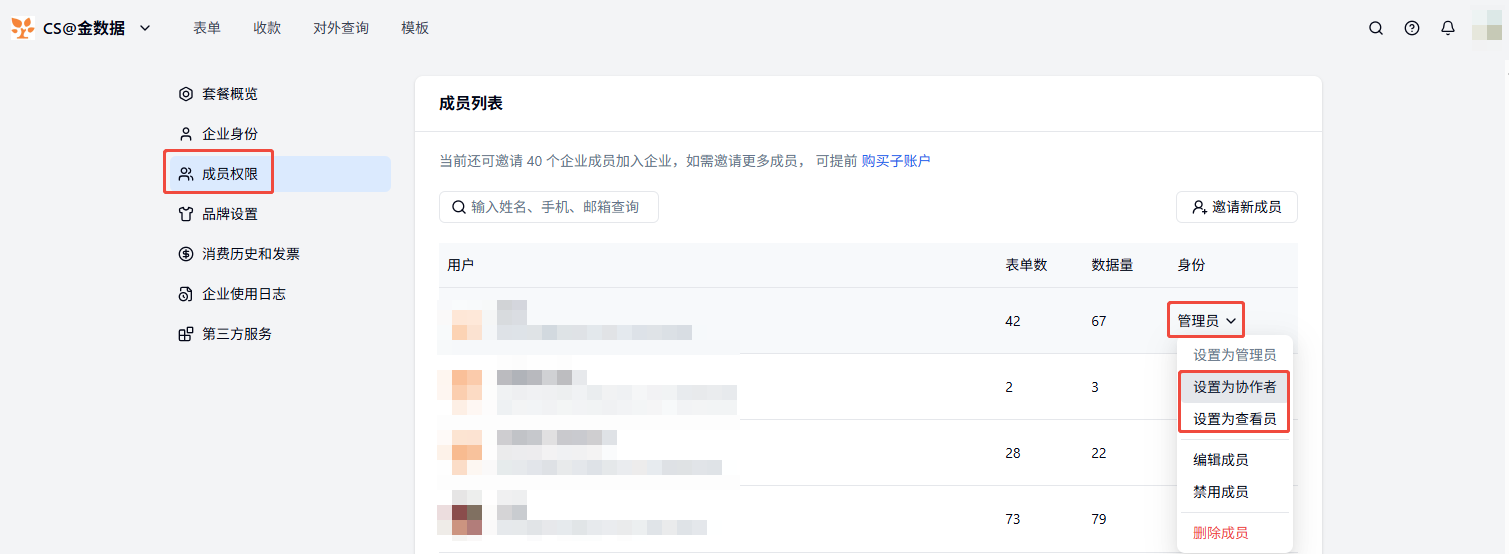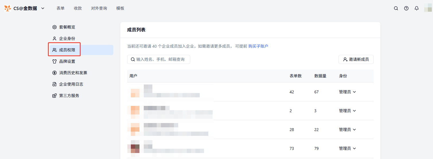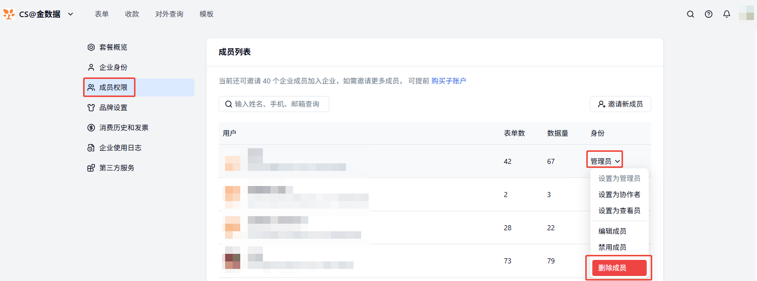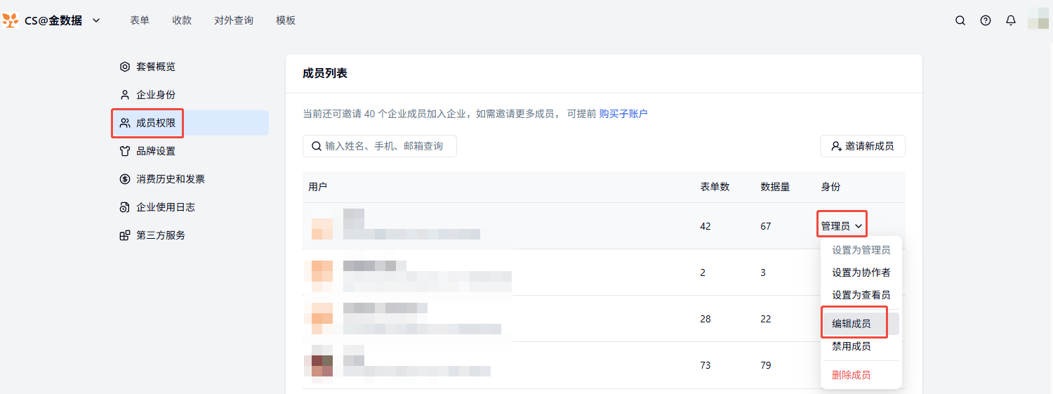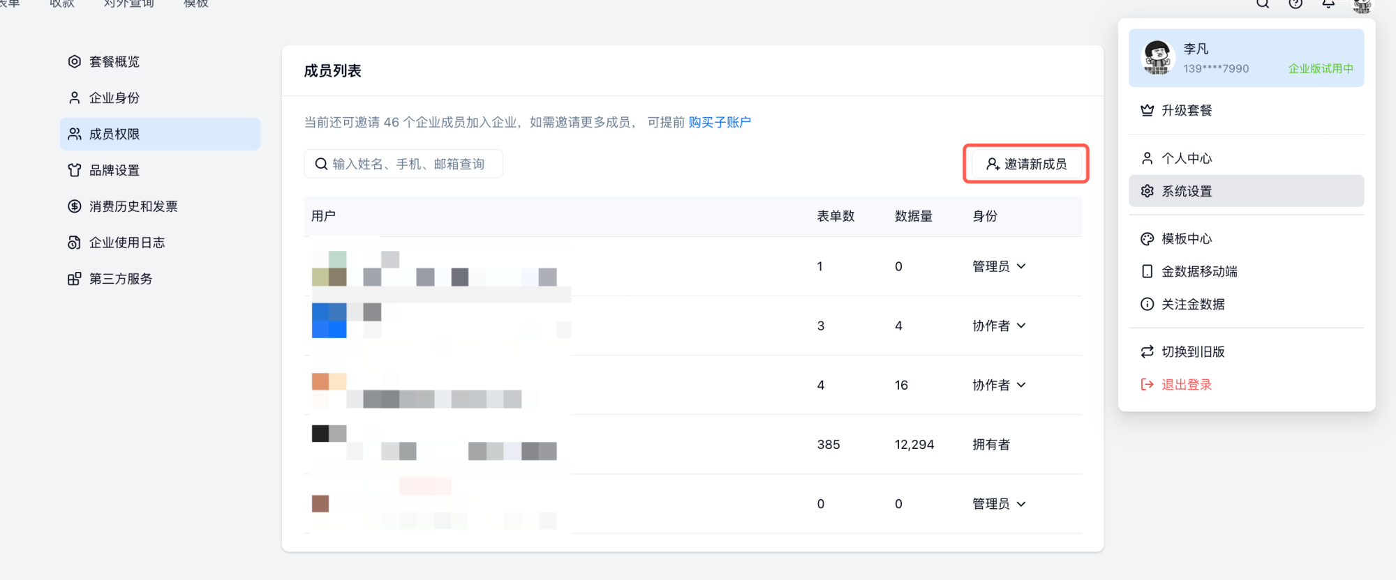 针对企业基础上及以上套餐版本的用户,点击右上角头像,在「系统设置」→「成员权限」→「成员列表」查看成员账号下的表单数和数据量了解账号当前的使用情况,也可邀请新成员、更改成员账号身份。