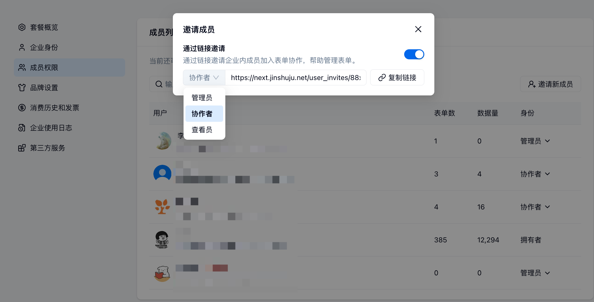 企业主账号或企业成员管理员可在「系统设置」→「成员权限」→「成员列表」,点击「邀请新成员」,开启链接邀请按钮,选择身份为「协作者」后复制邀请链接发给同事,同事点击后即可注册或登录金数据账号,成为企业成员。
