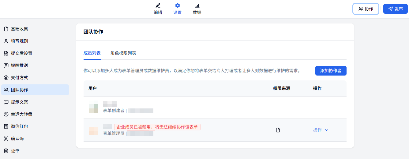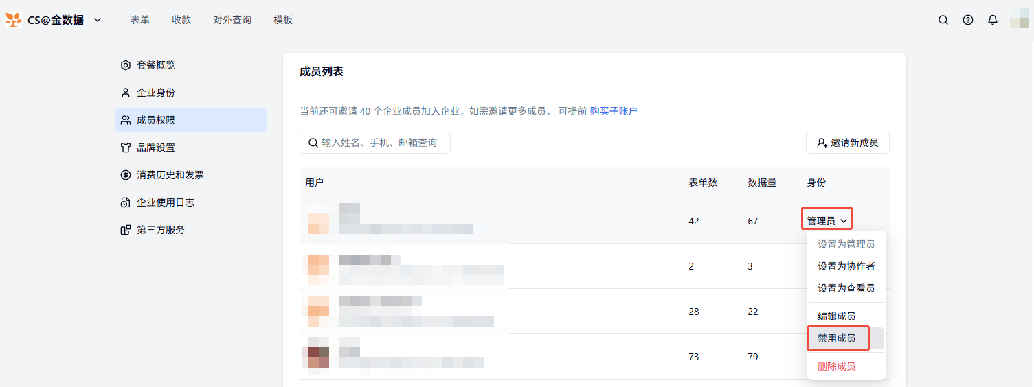 如成员的工作有短暂变动,后续可能会恢复,或将账号转交给其他同事,可操作其账号禁用,禁用后可再次启用其账号,禁用期间其账号下数据不会被删除,启用后可重新查看,但禁用期间其名下表单不可收集数据。