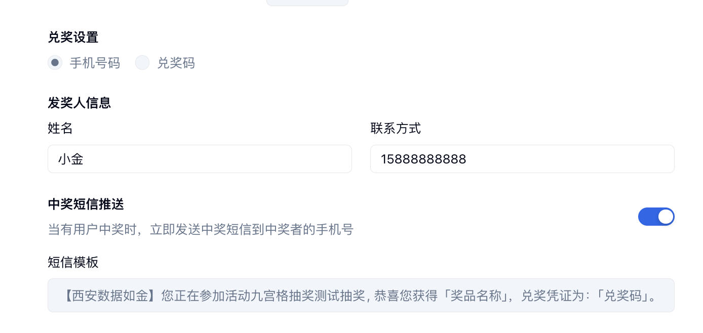 可根据自己需求开启中奖短信推送,系统会根据你设置的活动名称、奖品名称以及兑换方式,将相应的短信模板进行修改后并发送给中奖人。