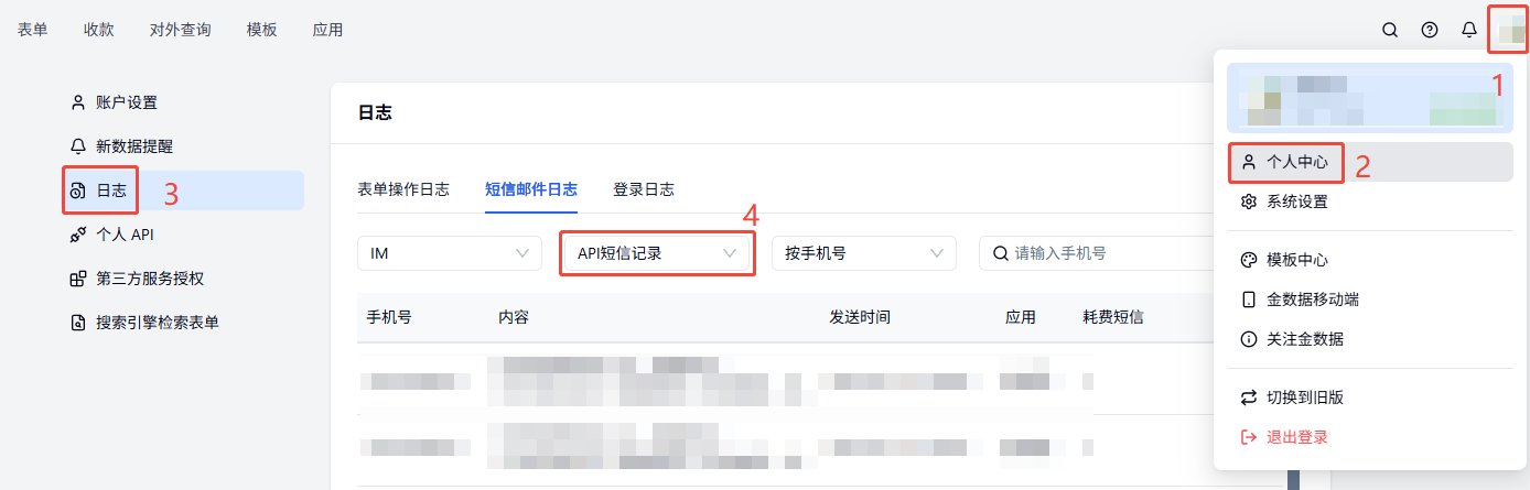在金数据首页「个人中心——日志——短信邮件日志——API 短信记录」可以查看到所有营销应用的短信发送情况。