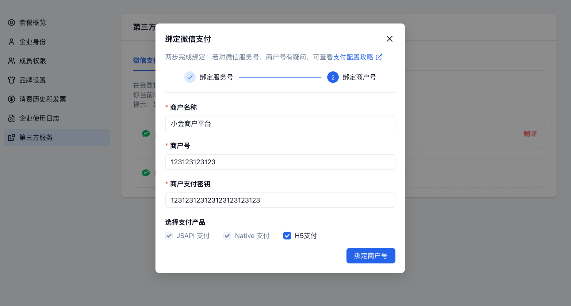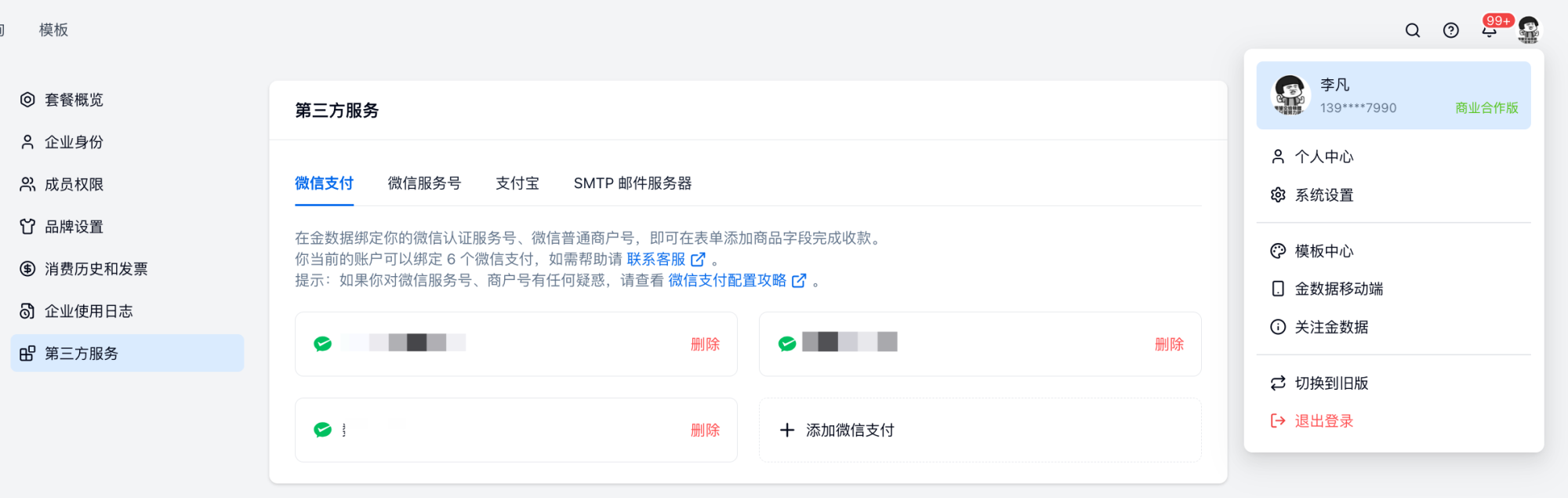在金数据官网,账号主页点击右上角「系统设置」→「第三方服务」→「微信支付」