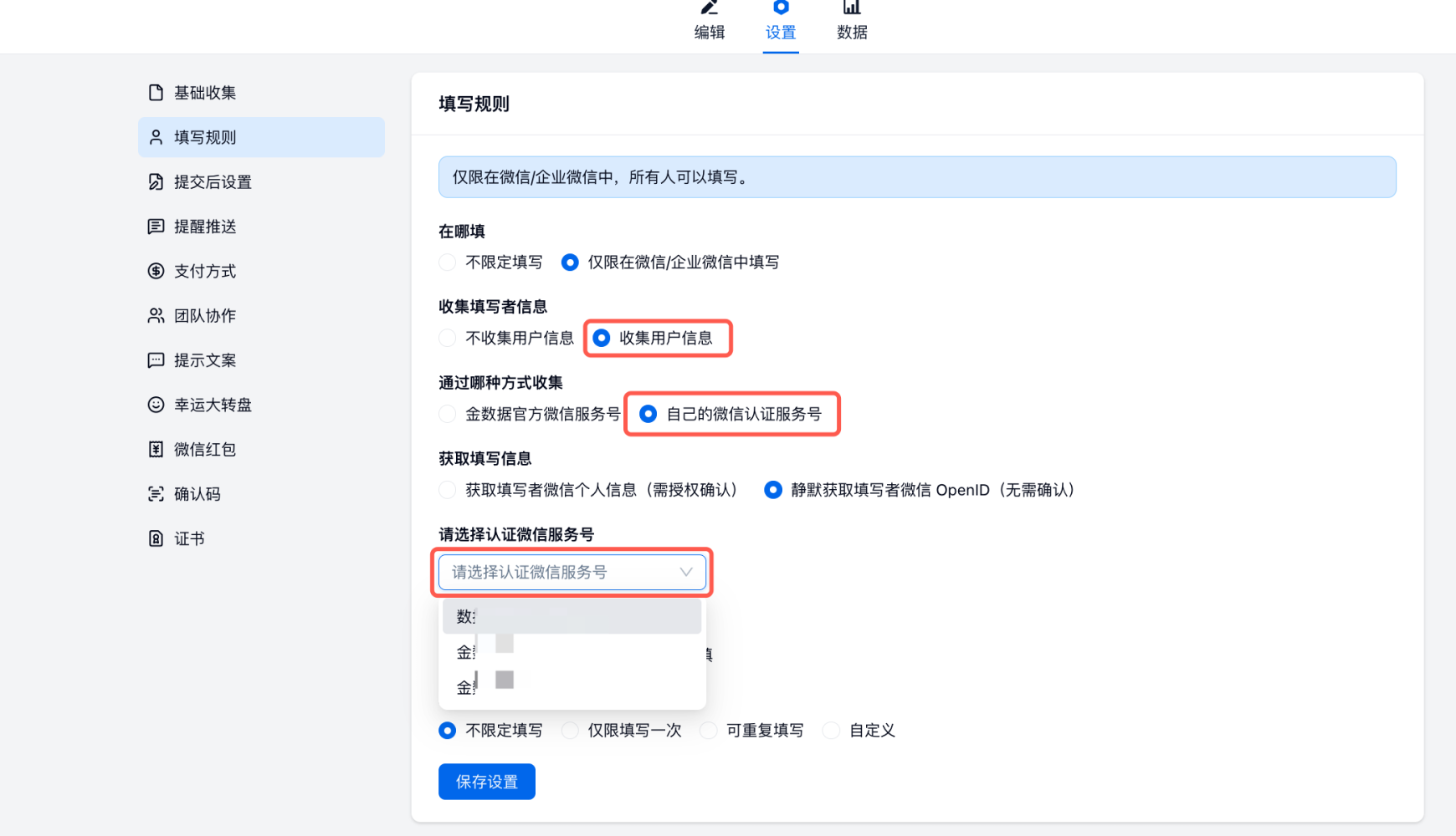 原因:这是因为表单用来收集填写者微信个人信息的微信服务号,跟该表单选择的收款微信服务号不一致