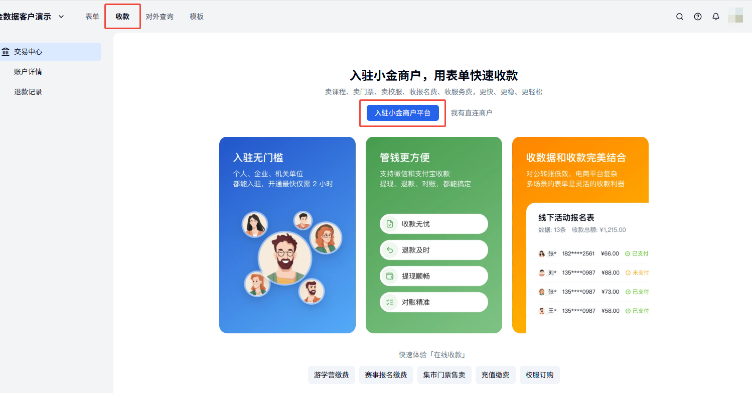 登录金数据账号 → 点击左上角「收款」→ 选择「入驻小金商户平台」→ 按提示完成开通。