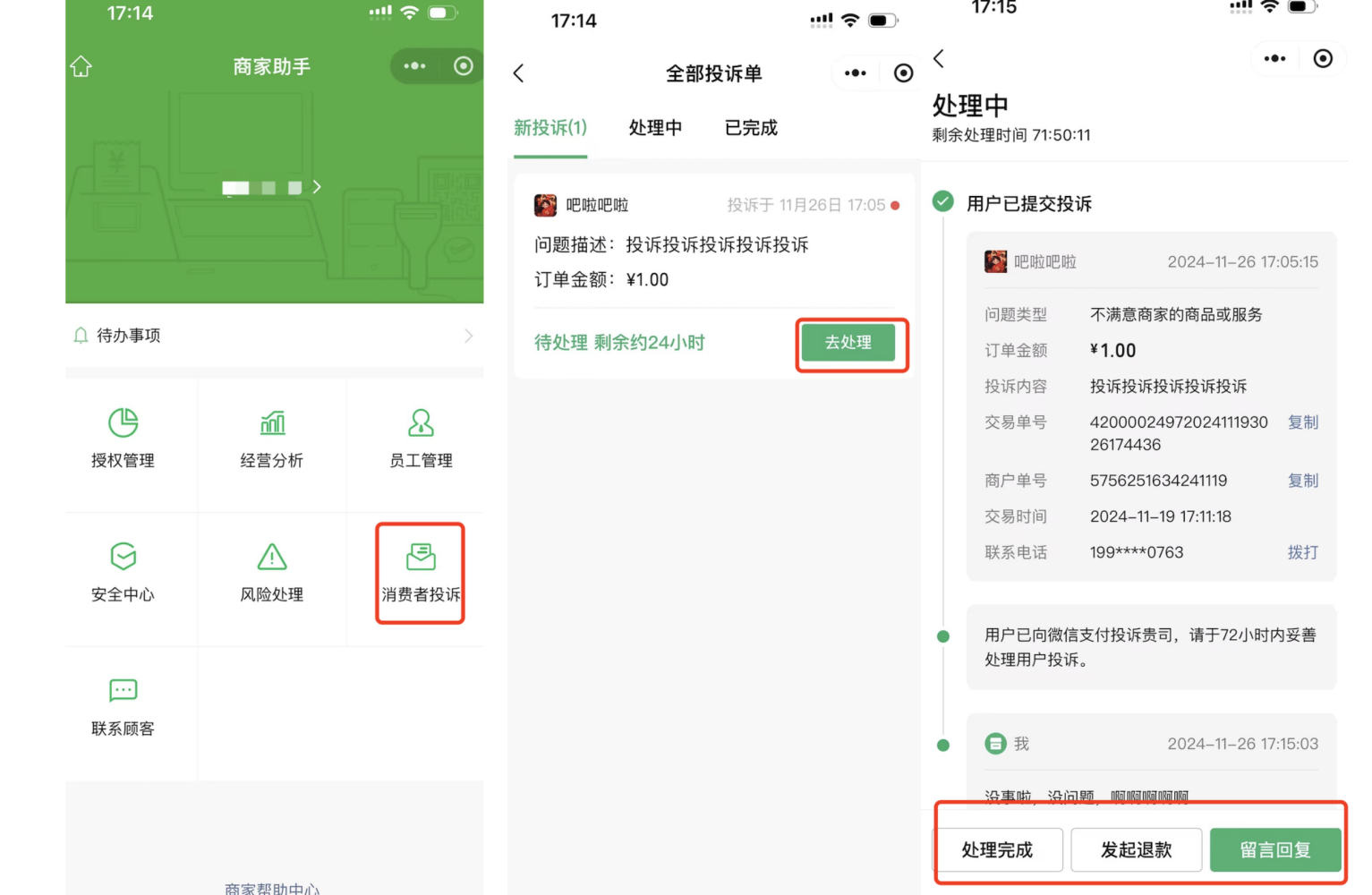 通过商户助手小程序处理,建议 24 小时内完成 |